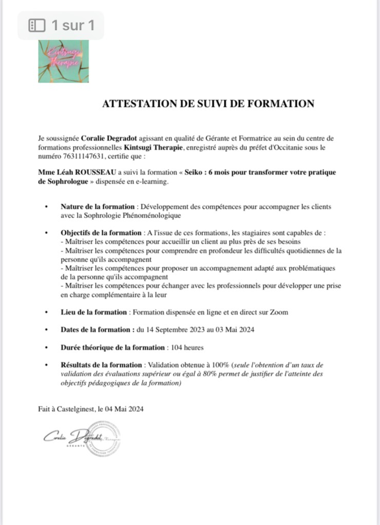 Durant mon parcours, j’ai effectué différentes formations pour avoir une méthode complète et adapté afin de pouvoir personnaliser mes accompagnements à chaque personnes que je rencontre.